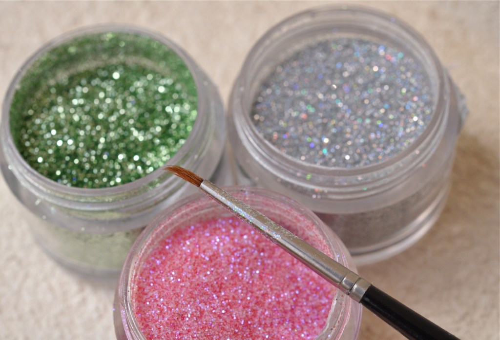 The Frost Effect: Dip a fine dry artists paintbrush (only for use with food) into a pot of edible glitter. Hold the paintbrush over the item, gently tapping the brush handle with your finger to release the dust and sprinkle over… it’s that simple!