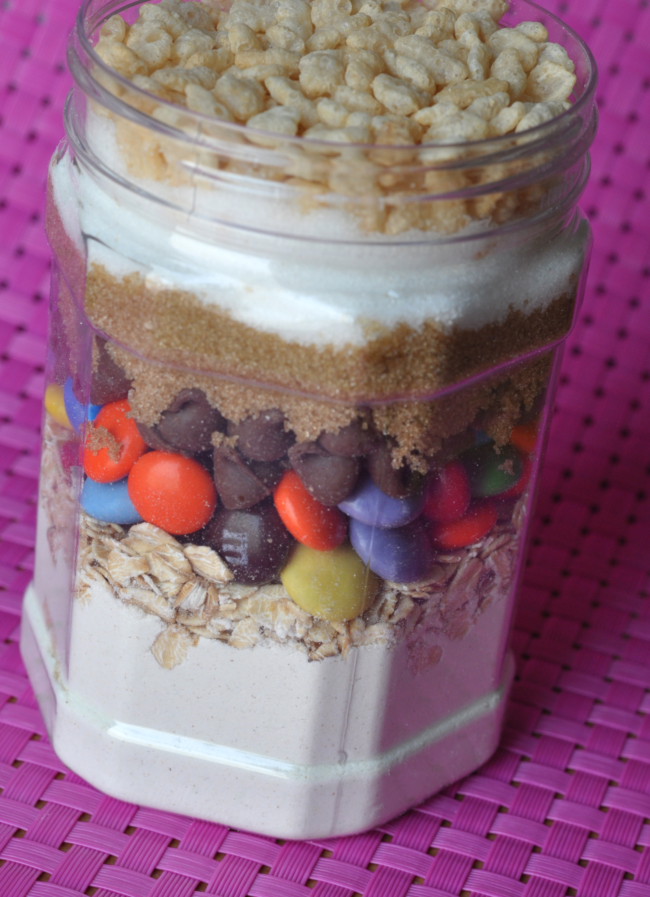 Layer each ingredient in the order given from the above recipe starting with the flour and ending with the Rice Krispies into the jar. The jar will be full to the brim and you may need to press the last layer of ingredients down into the jar so they fit, if a bigger jar was used the ingredients would move around and spoil the layers.