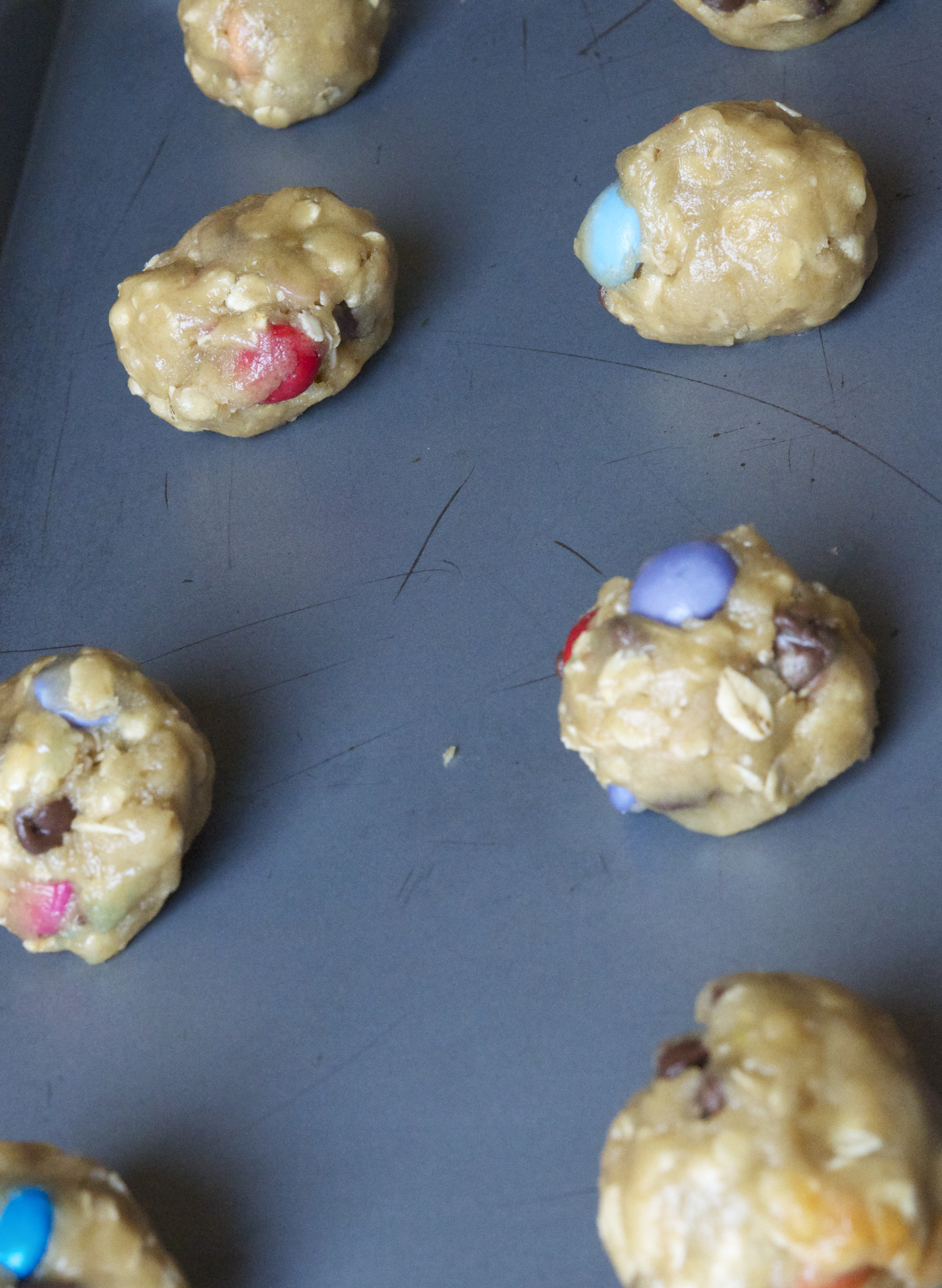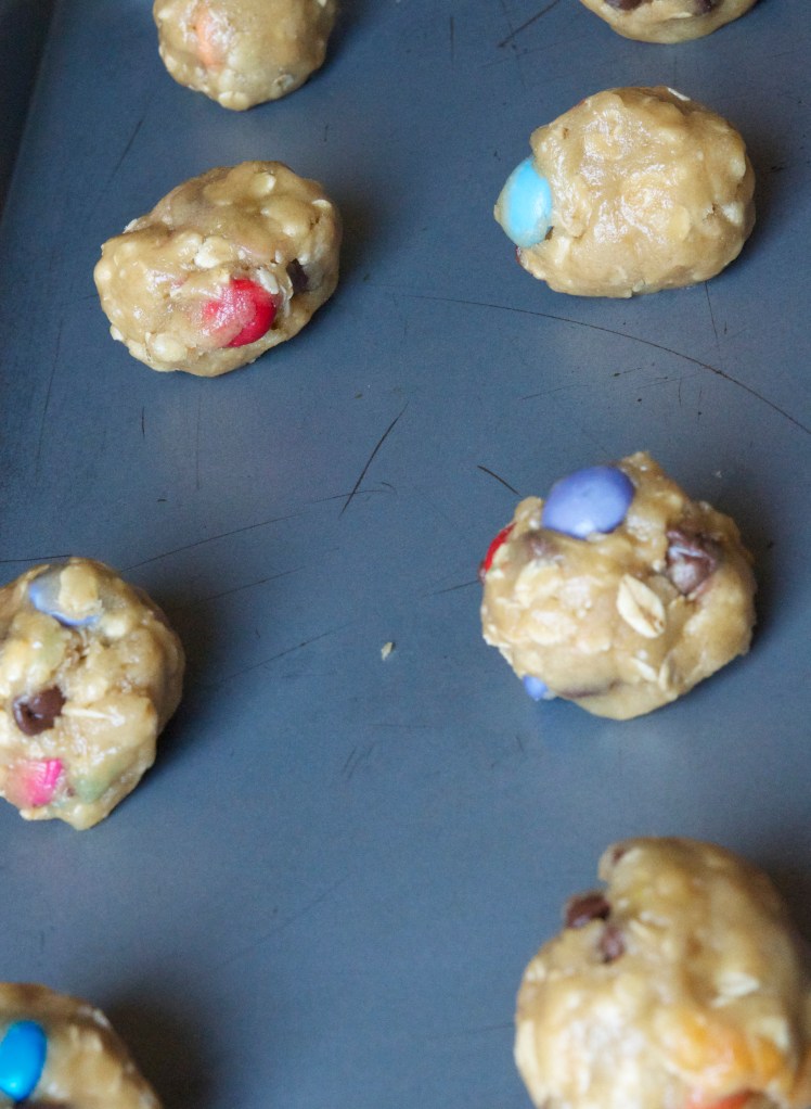 Break off walnut sized pieces of cookie dough and shape into balls, then place 2 inches apart on a non-stick cookie sheet.