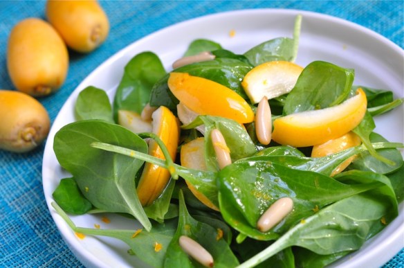 With a bag-full of baby spinach in the fridge and these crunchy dates reminding me of apples, I decided to make a quick salad with an orange vinaigrette dressing for a quick bite to eat. Serving this salad with a nice piece of grilled fish would have made a more filling meal… but I was trying to make up for all those sweet ripe dates that I have overly consumed lately!