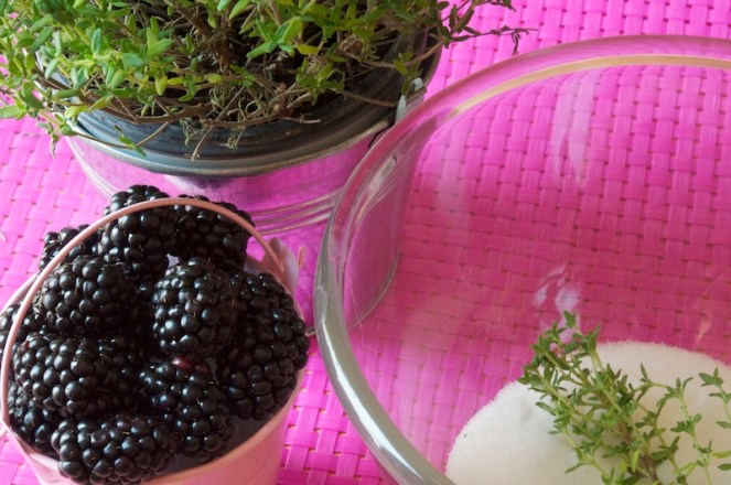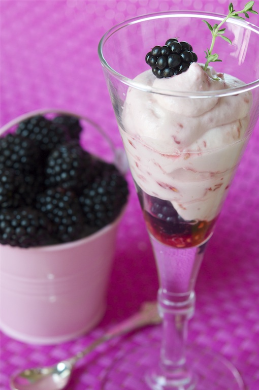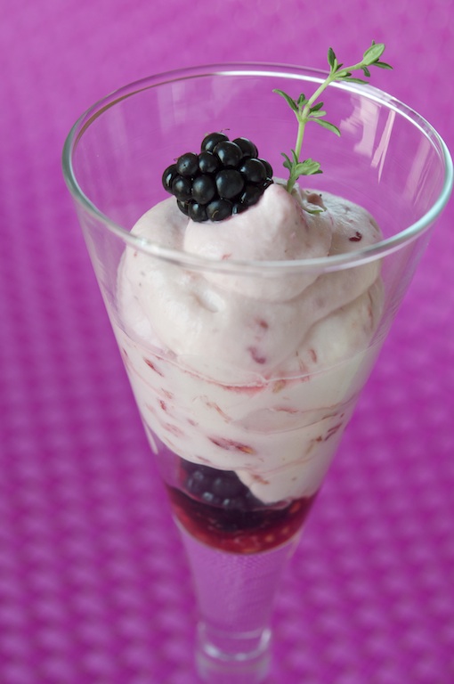 Assembling the dessert: Place a teaspoon of raspberry jam at the bottom of each glass, followed by a whole blackberry. Spoon or pipe the raspberry mousse evenly into each glass and top with another whole blackberry, garnish with thyme just before serving.