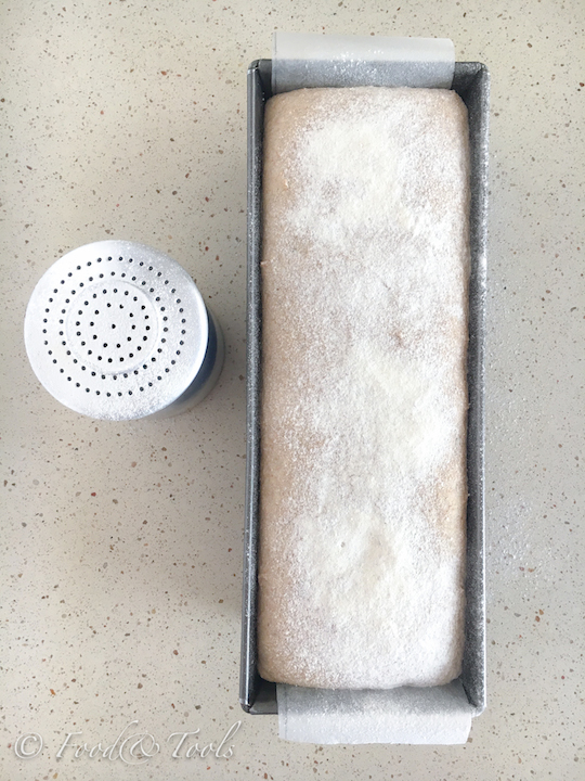 Kitchen equipment that made kneading this dough easier was the dough hook on my stand mixer. You can mix by hand using a sturdy wooden spoon, but it requires more effort. It’s a very sticky dough so all the mixing/kneading and the first rise is in the same bowl. Depending how warm your kitchen is, proofing times vary. The second rise is in the baking tin so you wont need to worry about shaping the loaf. Once the dough reaches the top of the tin (proofing for about 1 hour and 45 minutes) (also see note at end of recipe), it’s ready for baking in a preheated oven. Before baking loaves of bread (also sourdough and Irish soda bread), I like to dust the surface of the dough with plain flour for a more rustic looking loaf, this step is optional.