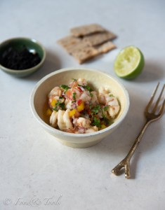 Ceviche is typically made using the freshest of raw fish marinated for a short time in citrus juices, chopped vegetables, chili and coriander and must be eaten fresh so any chance of food poising is avoided. We absolutely love ceviche and do not have a problem eating raw fish but know friends who do. This recipe is a little different as the prawns are lightly poached in a concentrated brew of Lapsang Souchong before marinating.